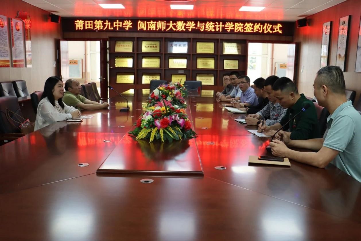 副院长周仕荣教授与数学系系主任黄菊副教授代表学院,前往莆田市第九中学,共同举办实习教育签约仪式。莆田市第九中学朱国忠校长、陈山副校长、徐的义副校长、张弦副校长,以及办公室主任李希雄、教研室主任吕炜、教务处负责人郑建彬等校领导出席了本次签约仪式。双方代表在友好、热烈的氛围中进行了深入的交流,并就实习教育的合作内容、方式及未来发展前景进行了深入探讨。