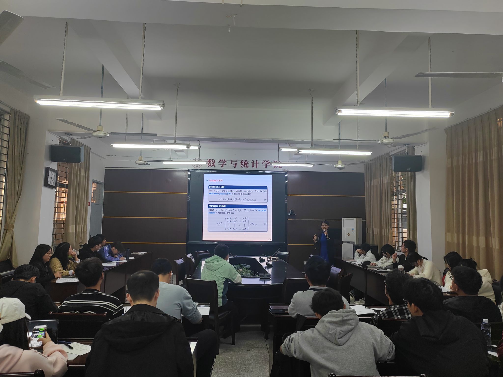 邀请,11月29日下午,山东大学冯俊娥教授在砺志楼114作了题为《有限博弈及其矩阵半张量积表示》的报告。相关师生聆听了此次报告,报告由林艺东老师主持。