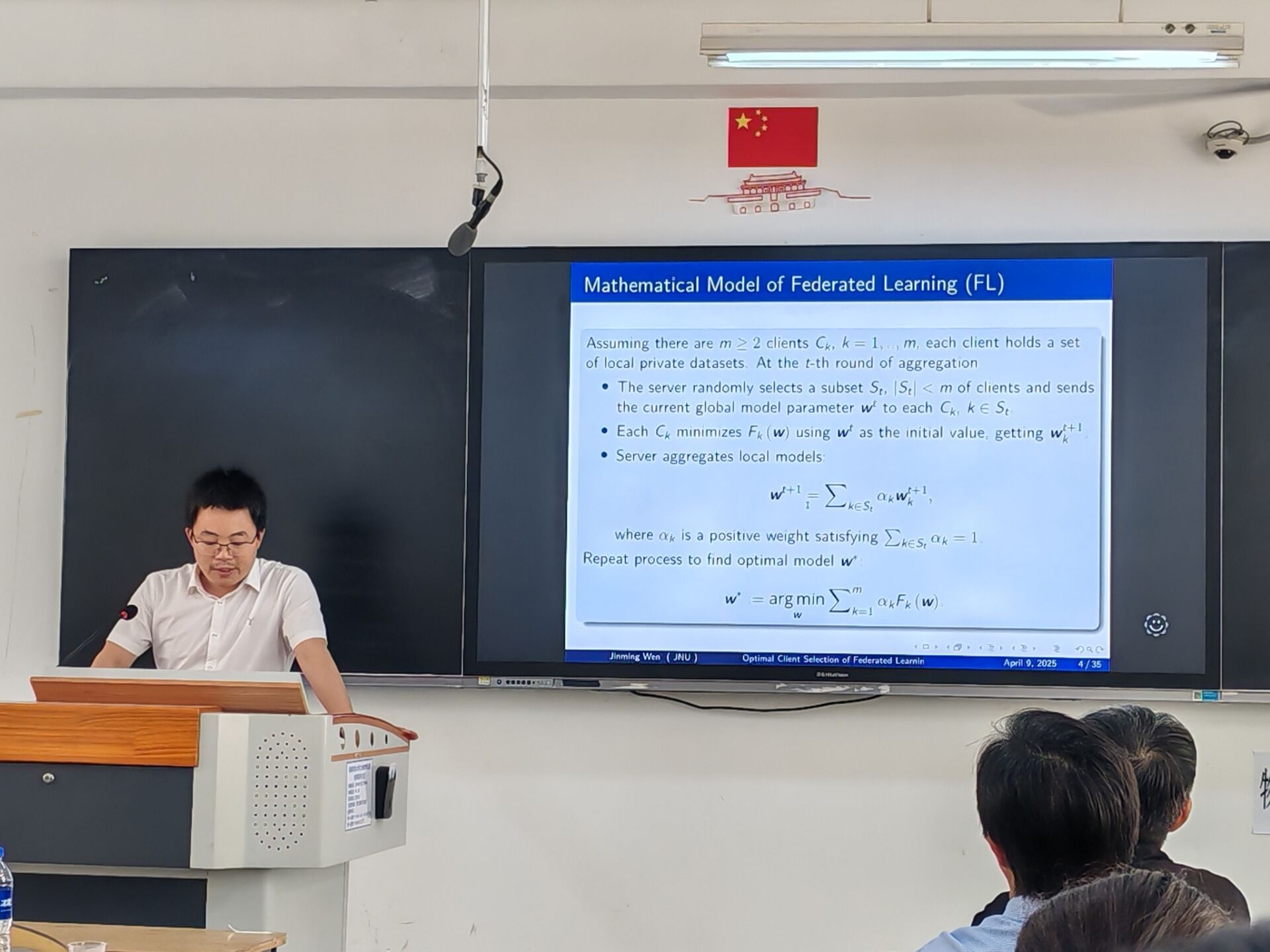 邀请,2025年4月10日下午,暨南大学温金明教授在在砺志楼304教室成功举办了题为“Optimal Client Selection of Federated Learning Based on Compressed Sensing”的学术报告会。相关师生聆听了此次报告,报告由吴晓锋老师主持。