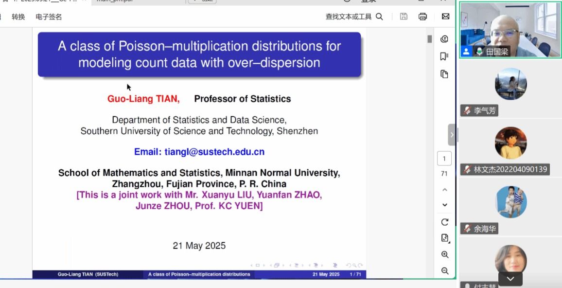 邀请,5月21日下午,南方科技大学田国梁教授在腾讯会议分别作了题为《A class of Poisson--multiplication distributions for modeling count data with over-dispersion(I)》和题为《A class of Poisson--multiplication distributions for modeling count data with over-dispersion(Ⅱ)》的两场讲座。相关师生聆听了此次讲座,讲座由施建华老师主持。