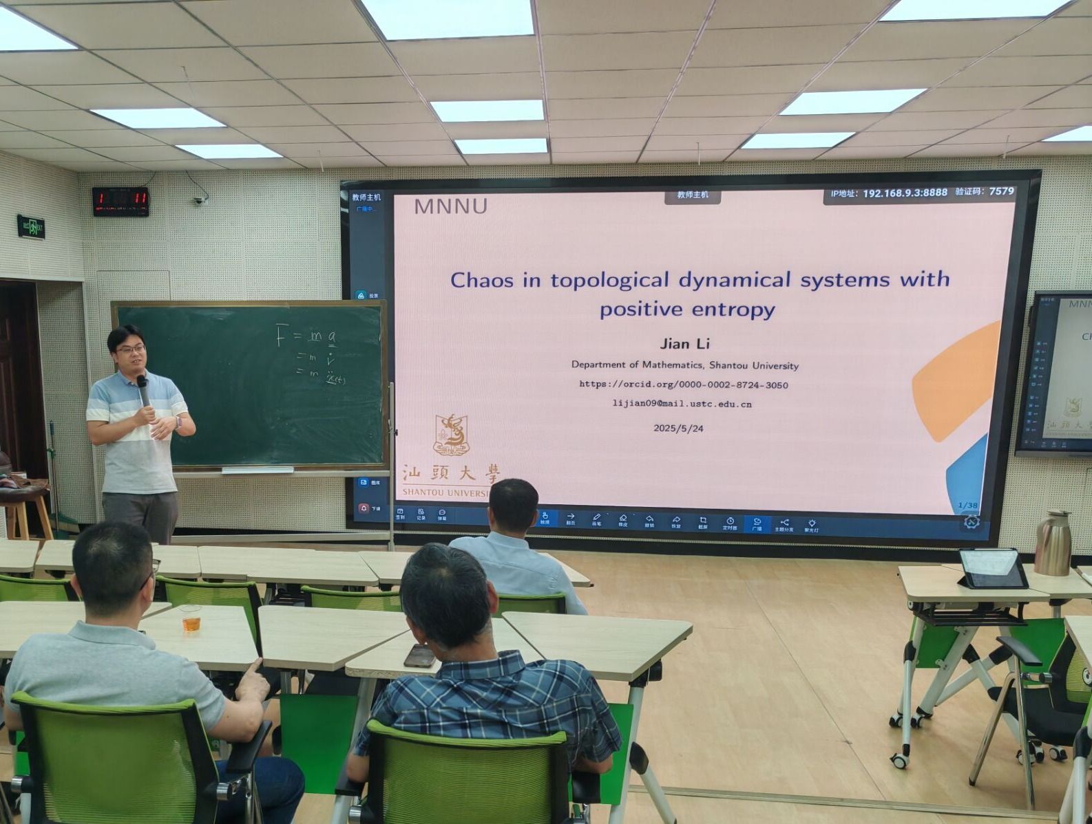 邀请,5月24日下午,汕头大学数学科学学院李健教授在砺志楼131作了题为《Chaos in topological dynamical systems with positive entropy》的报告。学院相关方向的教师和研究生参加了此次讲座,讲座由唐忠宝老师主持。