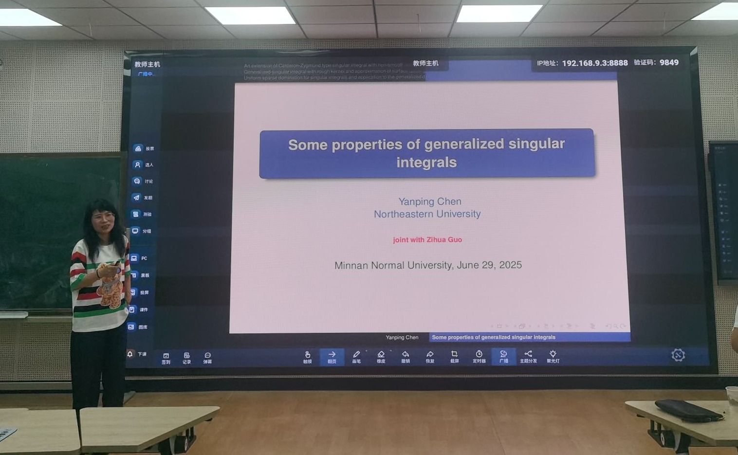 邀请,6月29日早上,东北大学陈艳萍教授在砺志楼131作了题为《Some properties of generalized singular integrals》的讲座。相关师生聆听了此次讲座,讲座由温泳铭老师主持。