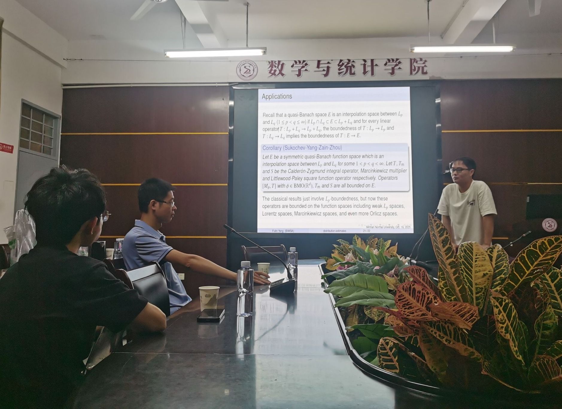 邀请,10月19日下午,北京雁栖湖应用数学研究院杨福林博士后在砺志楼114作了题为《Optimal distribution estimates for commutators and Marcinkiewicz multipliers》的讲座。相关师生聆听了此次讲座,讲座由温泳铭老师主持。