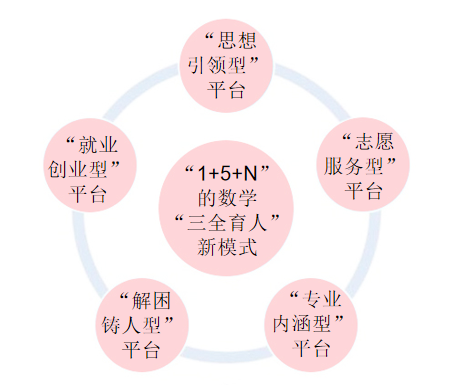 学院围绕数学特色,有计划地推进“三全育人”工作创新发展,促进学生成为有理想信念、有奉献精神、有专业素养、有远大抱负、有阳光心态的“五有”优秀数学人才。一是全员合力以“卓越计划”打造数学优势。始终本着以生为本、个性化教育的原则,培育“卓越中小学教师”、“卓越统计师”、“卓越金融师”,培养拔尖优秀人才。“以需定学”,从社会对人才的需求出发,加快精英化人才培养步伐,立足校内,拓展校外市场资源,发掘校内外专家,以校内外导师共同培养的师徒制推动计划实施。二是分阶段全过程凝练数学特色。提升本科生科研能力,学院在全校率先创立“提高班-加强班-创新班”分年级分层次稳步提升科研能力的各班次,强化基础,训练科研,突出创新,培养全面发展的本科生人才。三是全方位培育数学人才。学院积极构建学校、家庭、社会、学生“四位一体”的协同育人机制,充分调动党政管理干部、辅导员、班主任、思想政治教师及专业教师、学生家长、政府机关、企事业单位、校外知名人士、优秀校友、党员学生干部等的力量,共同承担育人职责,为学生成才提供全方位服务。学院遵循教书育人规律和学生成长规律,在教学发展、学科建设、科研促进、第二课堂等领域始终围绕数学特色,完善和规范学生在数学方面的知识、能力、素质培养内容,形成知识传授与能力培养并重,专业素质和人文素养教育并举的全方位育人模式。
