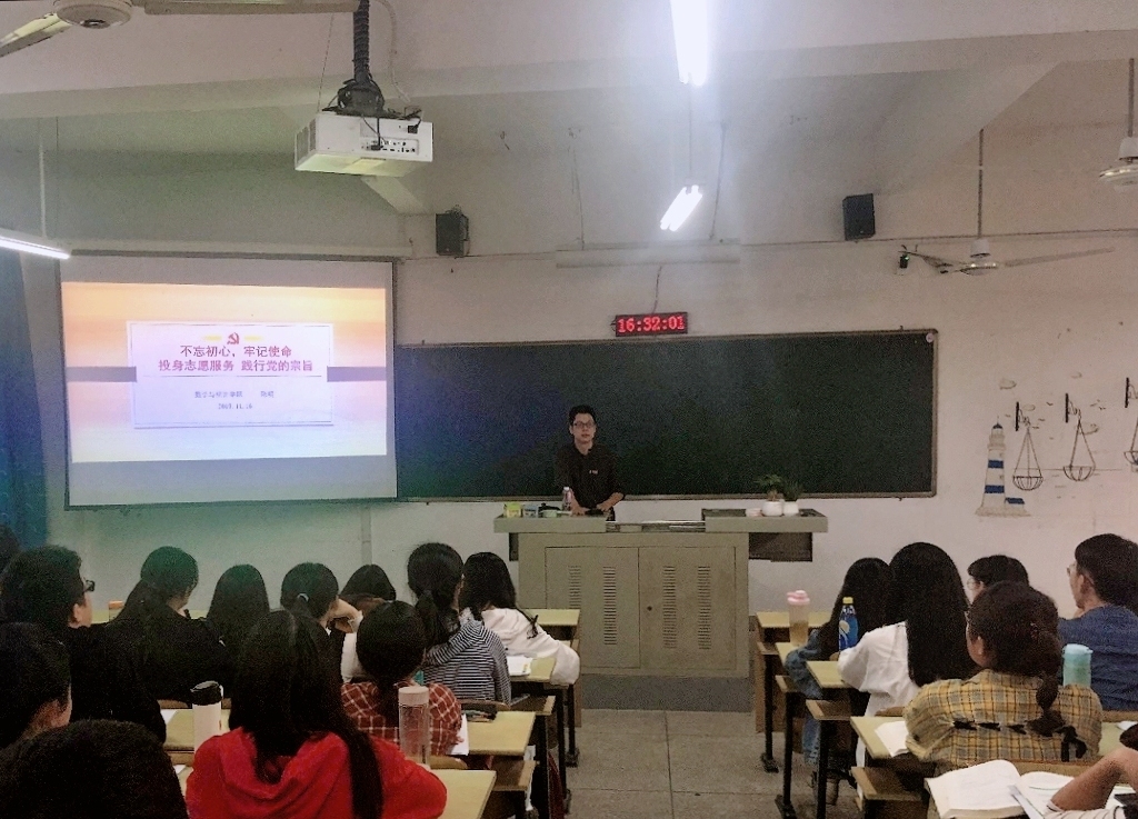 团委书记陈明在砺志楼130开展以“不忘初心、牢记使命,投身志愿服务、践行党的宗旨”为主题的专题党课。