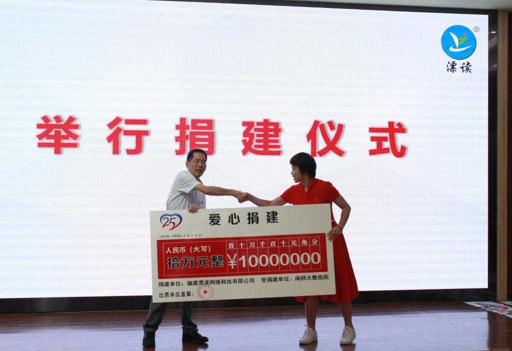 在捐赠仪式上,福建漂读网络科技有限公司董事长柯桂香代表92级数专向学院捐献拾万元,主要用以支持学院学科、教学、科研的基础建设。林梦雷代表学院对校友感恩母校、情系闽师、慷慨捐赠的善举表示衷心感谢。他指出,校友的捐赠寄托了对母校的深情厚谊、对学生的关爱以及对教育事业的情怀。福建漂读网络科技有限公司与韩国av