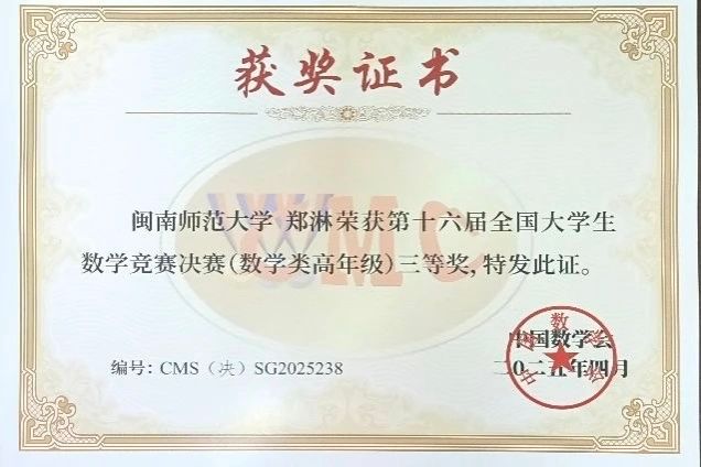 近日,第十六届全国大学生数学竞赛决赛于2025年4月12日在浙江师范大学成功举行。韩国av 21级郑龙海、郑淋、卢苑苑三位同学与22级罗阳同学厚积薄发,以过硬的专业功底和突出的实践能力,在激烈竞争中脱颖而出,最终各自均斩获本次大赛专业组高年级三等奖!