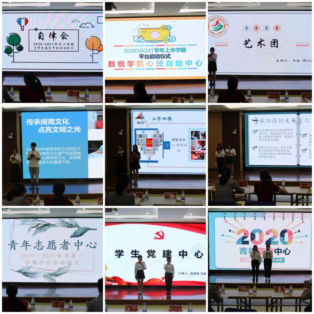 会上,学院各大学生组织围绕思想引领平台、志愿服务平台、学风建设平台、文体建设平台、创新创业平台五大平台对本学期活动进行汇报展示。“青春心向党,传承党力量”,学生党建中心新学期将在原有基础上推出“青春心向党,我想对你说”等少数民族系列活动,深入推进“三位一体”结对子“传、帮、带”育人机制,弘扬爱国主义精神,共育民族团结之花。“团青春赤心,立爱国之魂”,团委将开展五四红旗团支部暨先进班集体评选、办公软件培训等活动,以团校培训促进学生干部间沟通与交流,增强凝聚力与创新力,充分发扬“统筹、协调、服务、奉献”的精神,加强团自身建设。“星芒进步缀航方,苒新征途再破浪”,青年宣传中心将追随时代脚步,采用“抖音”这一新技术平台加强学院宣传力度,促进特色品牌活动的发展。“疫路志愿揽芳华,万象更新寄新语”,疫情期间,青年志愿者中心积极开展线上爱心助教活动,深化志愿服务内涵、打造志愿服务品牌。“献吾辈之力,守樱花盛开”,新学期学生会将延续新老交流、数学竞赛、考勤小队的传统打造学院良好学习氛围,增强理性思维提高数学兴趣,举办校新生篮球联赛等活动促进德智体美发展,并加强与其他部门的合作,提高效率,做到学才两得。回顾往期,在职业规划发展中心的组织下,学院《大设绘》、《钱鼠科技》等四个项目在互联网加创新创业大赛中获得十佳荣誉。未来,将继续如期推行教招模拟大赛等活动,丰富学生相关经验。心理自助中心将以“青年新主力,童心心向党”团辅活动,引导教职工子女积极茁壮成长,增强其疫情防范安全意识。艺术团将于11月底举办“建党百年岁月起华章,少年风华正茂共期顾”迎新晚会,弘扬以改革创新为核心的时代精神。新学期,自律会将推出“点亮数‘室’界,与你一见钟‘寝’”特色活动,激发“吾辈当自强,不负盛世韶华”的精神。