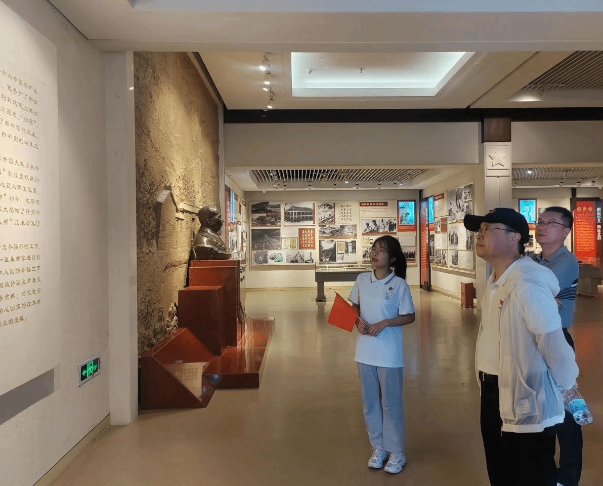 社会实践团成员声情并茂地向校领导一行宣讲红色故事,介绍馆内珍贵的历史照片和文物,展现连日来的实践成果。林副校长认真听取活动开展情况汇报,与队员们交流心得体会,对大家结合专业特色开展的红色故事宣讲等活动给予充分肯定与高度评价。