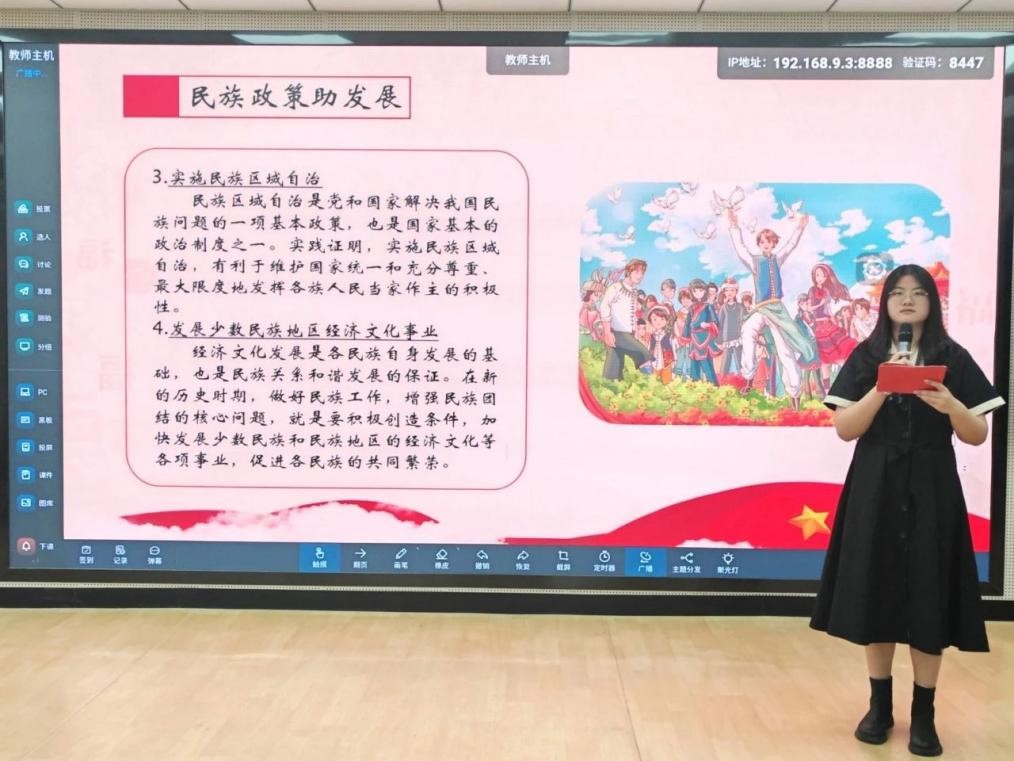 学生干部林晓枚同学在大会上介绍了我国民族方面的基本国情和国家民族政策,展示了新中国成立以来,在党中央坚强领导下我国民族政策取得的一系列伟大成就。林晓枚同学还呼吁,广大青年团员要自觉履行维护民族团结的义务,树立远大理想,努力学习科学文化知识,为维护民族团结贡献自己的力量。
