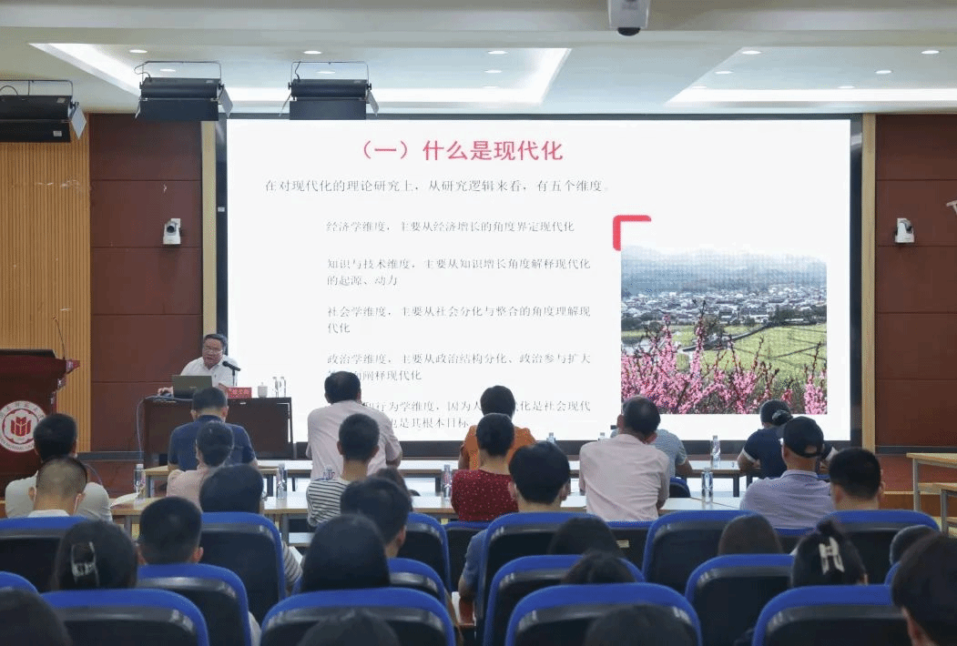 课上,郑文海教授结合大量时事案例,围绕“中国式现代化的实践历程”、“中国式现代化理论的重大创新”和“推动中国式现代化必须把握的重大原则和重大关系”三个方面,深刻阐述了中国式现代化的内涵和本质。他强调,只要有愚公移山的志气、滴水穿石的毅力,脚踏实地,埋头苦干,积跬步以至千里,就一定能够将中国式现代化变为美好现实。