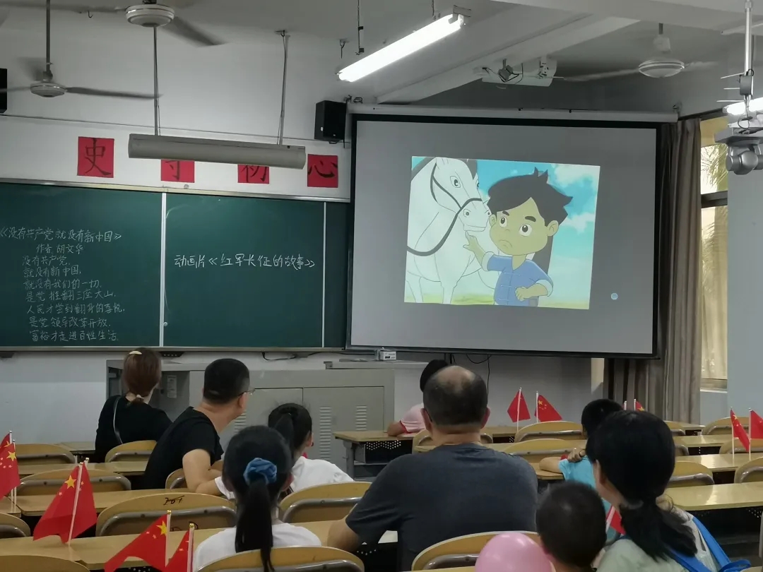 本次活动包含两个环节:一是观看党史视频。通过播放党史动画片《红军长征的故事》,再现长征这段波澜壮阔的伟大历史;二是朗诵红色诗歌。通过引导学生家长和学生一起朗读《没有共产党就没有新中国》,让学生们体会到中国共产党的伟大。